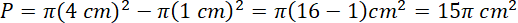 Aby obliczyć pole pierścienia, od pola zamalowanego koła o promieniu (3 + 1) cm musisz odjąć pole koła o promieniu 1 cm