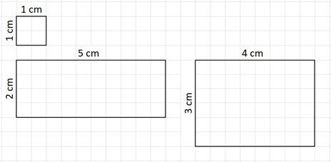 Po policzeniu powierzchni, czyli ilości kwadratów znajdujących się w danym prostokącie, można stwierdzić, że prostokąt o wymiarach 2 cm x 5 cm jest mniejszy od prostokąta o wymiarach 3 cm x 4 cm.