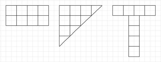 Dwie kratki mają długość 2 cm, zatem aby powstała figura, która ma 8 cm2, potrzeba 8 kratek, bądź 16 połówek kratek.