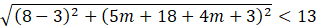 Wyznacz wartości m, dla jakich odległość wyznaczona przez punkty A(3, -4m-3) i B(8, 5m+18) jest mniejsza od 13.