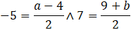 W tym zadaniu musisz określić jaki będzie wynik dodania do siebie liczb a oraz b, jeśli wiesz, że odcinek łączący punkty zadane współrzędnymi (a, 9) oraz (-4, b) ma środek w punkcie S o współrzędnych (-5, 7).