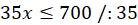 Oznacz x jako liczbę osób. Utwórz nierówność, w której po jednej stronie znajdzie się cena od osoby, czyli 35, pomnożona przez x i dodaj do tego 100 zł za rezerwację toru i to ma być równe lub mniejsze, od kwoty jaką właścicielka salonu może wydać na imprezę, czyli 800 zł. Oblicz tę nierówność.