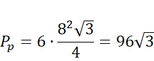 Objętość ostrosłupa to pole podstawy razywysokości ostrosłupa. W podstawie tego ostrosłupa jest sześciokąt, którego pole jest równe sumie pól 6 trójkątów równobocznych boku równym krawędzi podstawy.