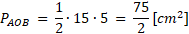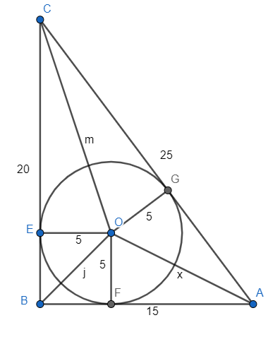 W trójkącie ABC wpisano okrąg o środku O i promieniu 5 cm. Znane są długości boków tego trójkąta: |AB| = 15 cm, |BC| = 20 cm, |CA| = 25 cm. Oblicz pola trójkątów AOB, BOC, COA oraz ABC.