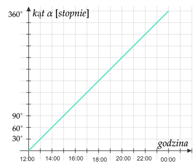 W tym zadaniu musisz wyznaczyć, jaki kąt zatacza wskazówka od godziny dwunastej do godziny podanej w tabelce, a następnie sporządzić wykres powstałej funkcji.