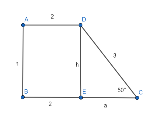 W tym zadaniu oblicz obwód trapezu prostokątnego, którego kąt ostry ma miarę 50˚, krótsza podstawa ma długość 2, a dłuższe ramię ma długość 3.
