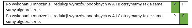 | Po wykonaniu mnożenia i redukcji wyrazów podobnych w A i C otrzymamy takie same sumy algebraiczne. | P | F |