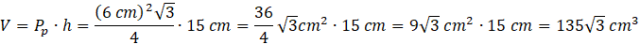 Oblicz objętość pudełka, w kształcie graniastosłupa prawidłowego trójkątnego, gdzie krawędź podstawy ma długość 6 cm, a krawędź boczna wynosi 15 cm.