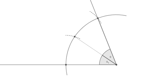 Aby odwzorować dany kąt, zatocz łuk przy podanym kącie, a następnie narysuj półprostą, czyli jedno z ramion kąta. Zatocz łuk o tym samym promieniu, co wcześniej (te czynności zostały już wykonane w tym zadaniu). Teraz odmierz cyrklem odległość od wierzchołka kąta do miejsca, w którym łuk przeciął półprostą. Wbij cyrkiel w miejsce przecięcia i zatocz łuk o odmierzonym chwilę wcześniej promieniu – przetnie się on z wcześniejszym łukiem. W ten sposób otrzymasz kąt alfa, powtórz cały proces, aby w sumie mieć kąt o mierze 2α.