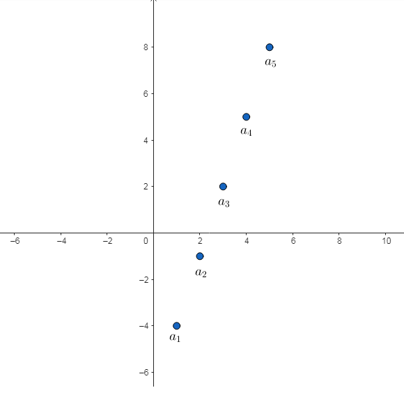 W tym zadaniu musisz odczytać współrzędne punktów zaznaczonych na wykresie, na ich podstawie wyznaczyć różnicę ciągu i jego pierwszy wyraz, narysować pięć pierwszych wyrazów tego ciągu w układzie współrzędnych i określić monotoniczność tego ciągu.