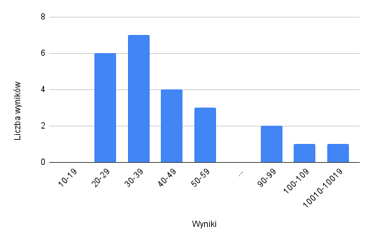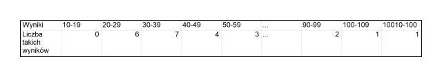 Stwórz tabelę, w której umieścisz liczbę osób, które podały wynik z określonego zbioru. Następnie stwórz wykres kolumnowy. Na osi poziomej zapisz podane zakresy. Na pionowej osi zaznacz liczbę osób wskazujących poszczególne odpowiedzi (wartość maksymalna musi być co najmniej taka jak największa liczba osób wskazujących ten sam przedział). Następnie zarysuj słupki wskazujące, ile odpowiedzi zawiera dany przedział.