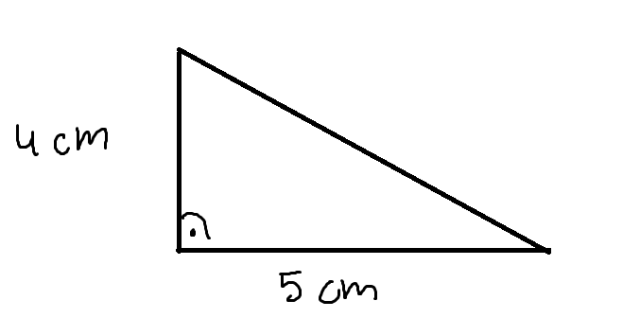 Narysuj kąt prosty, używając ekierki. Jeden bok przy kącie prostym ma mieć 4 cm, a drugi 5 cm. Następnie narysuj trzeci bok, aby powstał trójkąt.