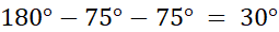 Kąt przy podstawie ma 75º, więc z tego wynika, że drugi kąt przy podstawie ma tę samą miarę, bo trójkąt jest równoramienny. Razem wszystkie kąty w trójkącie mają miarę 180º, więc aby obliczyć niewiadomy kąt, musisz od sumy wszystkich kątów odjąć miary kątów, które znasz. Wyjdzie wtedy miara trzeciego kąta.