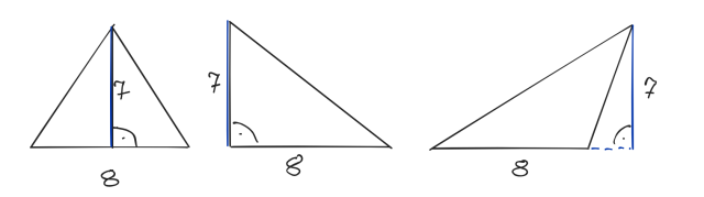 Wszystkie trójkąty mają podstawę równą 8 cm i wysokość równą 7 cm.