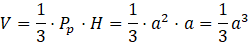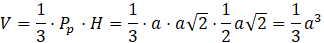 II – Podstawą ostrosłupa jest kwadrat o boku 𝑎, a jego wysokość to jedna z krawędzi sześcianu. Mamy więc: