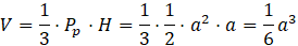 IV – Podstawą ostrosłupa jest trójkąt prostokątny, którego przeciwprostokątną jest przekątna kwadratu, a jego wysokość to jedna z krawędzi sześcianu. Objętość to: