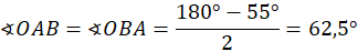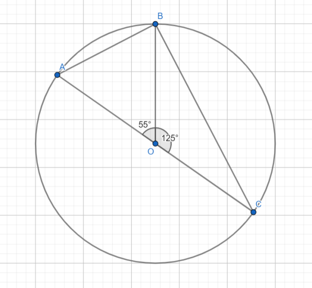 Na okręgu zaznaczono punkty A, B i C w taki sposób, że łuk AB wyznacza kąt 55°, a łuk BC – kąt 125°. Oblicz miary kątów w trójkącie ABC.