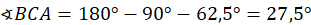 Zauważ, że te dwa kąty środkowe tworzą razem kąt półpełny, czyli odcinek AC jest przeciwprostokątną trójkąta prostokątnego ABC. Trójkąt ABO jest równoramienny, bo dwa z jego boków są promieniami okręgu, więc oblicz miarę kąta OAB korzystając z sumy kątów w trójkącie. Skorzystaj z sumy kątów w trójkącie ABC, aby obliczyć miarę kąta ACB.