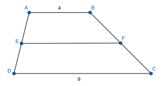 Wyznacz skalę podobieństwa otrzymanych trapezów, jeśli trapez o podstawach długości 4 cm i 9 cm podzielono prostą równoległą do podstaw na dwa trapezy podobne.