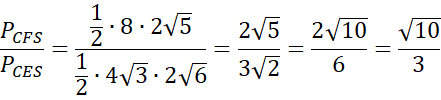 Wyznacz stosunek pola trójkąta CFS do pola trójkąta CES, jeśli krawędź podstawy ostrosłupa prawidłowego sześciokątnego ma długość 4, a krawędź boczna – długość 6.