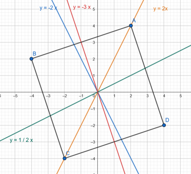 Zapisz równanie prostej, która nie jest osią symetrii kwadratu o wierzchołkach (2,4),(-4,2),(-2,-4),(4,-2)