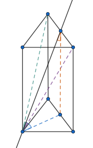 Wykonaj rysunek ilustrujący tę sytuację i zaznacz na nim kąty nachylenia prostej do płaszczyzny podstawy oraz do płaszczyzny każdej ze ścian bocznych, jeśli w graniastosłupie prostym o podstawie będącej trójkątem równobocznym poprowadzono prostą przechodzącą przez wierzchołek podstawy dolnej i środek przeciwległej krawędzi podstawy górnej.