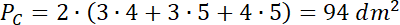 Oblicz pole całkowite podanego prostopadłościanu, a następnie dla każdej z trzech różnych ścian długość jej przekątnej, pole przekroju będące prostokątem o bokach długości trzeciego boku prostopadłościanu i obliczonej przekątnej, a na koniec sumę pól całkowitych powstałych graniastosłupów, czyli pola całkowitego prostopadłościanu i dwóch pól powstałego przekroju.