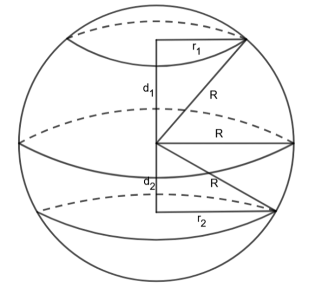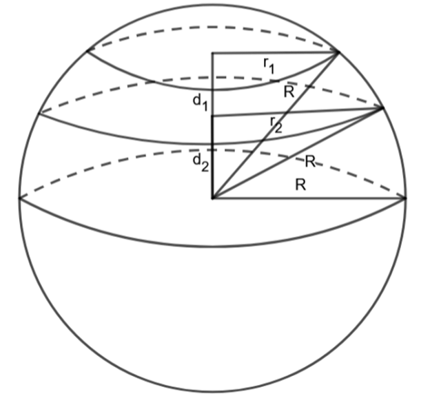 Zauważ, że promień kuli, powstałego koła i odległość ich środków tworzą trójkąt prostokątny. Skorzystaj z twierdzenia Pitagorasa, aby obliczyć promień powstałych kół, a następnie odległość ich środków.