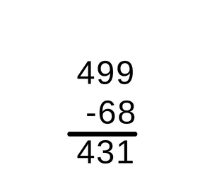 Wykonaj odejmowanie, by dostać liczbę, jaką należy dodać do 68, by otrzymać 499. Wykonując odejmowanie pisemne najpierw, należy w słupku odjąć od siebie cyfry jedności. Jeśli nie można odjąć cyfr, ponieważ odjemnik jest większy od odjemnej, to należy pożyczyć jedną dziesiątkę ze słupka z lewej strony. Wtedy odjemna w słupku, w którym wykonujemy odejmowanie stanie się o dziesięć większa, a odjemna w kolejnym na lewo słupku zmaleje o jeden. W taki sam sposób należy odejmować każdy kolejny słupek, zaczynając od prawej i idąc do lewej.
