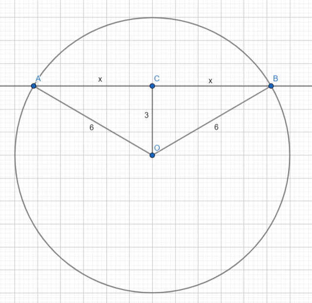 W okręgu o promieniu równym 6 zaznaczono cięciwę AB w odległości 3 cm od jego środka. Oblicz długość tej cięciwy.