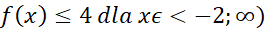 Aby rozwiązać to zadanie musisz narysować wykres podanej funkcji. W tym celu wyznacz jej wartości dla kilku jej argumentów, nanieś punkty na układ współrzędnych i stwórz wykres. Pomocne będzie również wyznaczenie miejsca zerowego i miejsca przecięcia z osią y (P = (0, f(0)). Odczytaj dla jakich argumentów wykres funkcji biegnie pod wartością 4 na osi y.