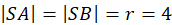 Odcinek SB jest środkową trójkąta SPA. Oblicz długość odcinka SP, jeżeli promień okręgu jest równy 4 i