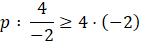 Zdanie Iloraz liczby 4 przez (-2) jest niemniejszy od iloczyny liczby 4 i (-2) zapisz w języku matematyki, a następnie podaj jego wartość logiczną. Gdy zdanie jest fałszywe podaj jego negację.