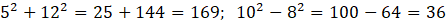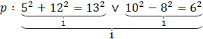 Używając symboli matematycznych zapisz zdanie Suma kwadratów liczb 5 i 12 jest równa kwadratowi 13 lub różnica kwadratów liczb 10 i 8 jest równa kwadratowi liczby 6, a następnie oceń jego wartość logiczną.