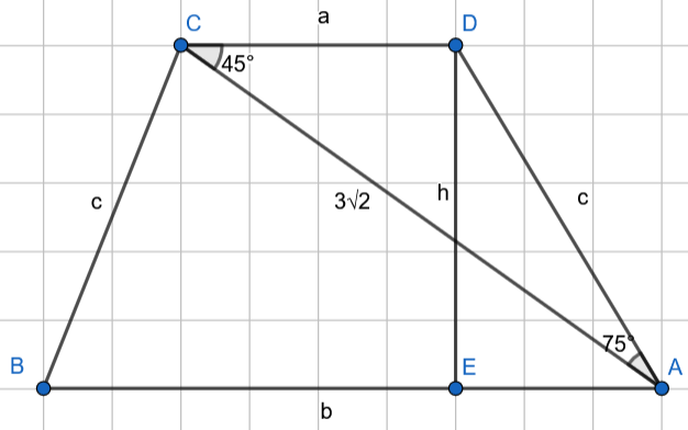 Wyznacz obwód trapezu równoramiennego, w którym przekątna o długości tworzy z krótszą podstawą kąt , a z ramieniem kąt .