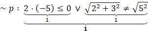 Zauważ, że zdanie złożoną jest koniunkcją dwóch zdań, więc jego zaprzeczenie jest alternatywą zaprzeczeń zdań składowych. Zauważ, że zaprzeczenie jest prawdziwe, ponieważ obie relacje są prawdziwe.