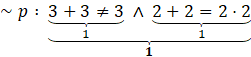 Zauważ, że zdanie złożoną jest implikacją dwóch zdań. Jego zaprzeczenie jest koniunkcją pierwszego zdania i zaprzeczenia drugiego. Zauważ, że negacja jest prawdziwa, ponieważ obie równości są prawdziwe.