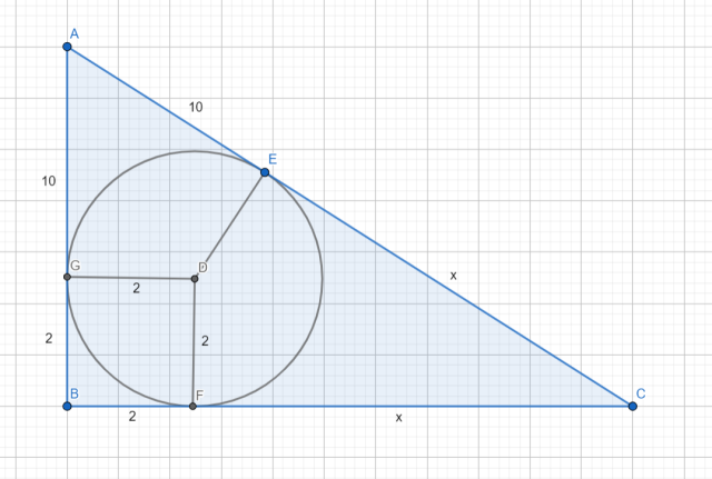 Oblicz wszystkie boki trójkąta prostokątnego opisanego na okręgu, jeżeli jedna z przyprostokątnych jest równa 12 cm, a promień jest równy 2 cm.