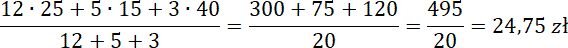 Oblicz, ile powinien kosztować 1 kg mieszanki cukierków, dodając do siebie iloczyny (ilość cukierków w kg razy cena za 1 kg) i dzieląc przez ilość wszystkich cukierków (w kilogramach).