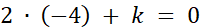 Podstaw do równania -4 jako x i 0 jako wartość funkcji i oblicz wartość k.