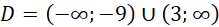 Aby otrzymać podany zbiór jako dziedzinę funkcji musimy umieścić w mianowniku ułamka i jednocześnie pod pierwiastkiem kwadratowym wyrażenie, które jest mniejsze lub równe 0 dla x większych lub równych -9 i jednocześnie mniejszych lub równych 3. W ten sposób wyrzucimy wartości w tym przedziale z dziedziny.