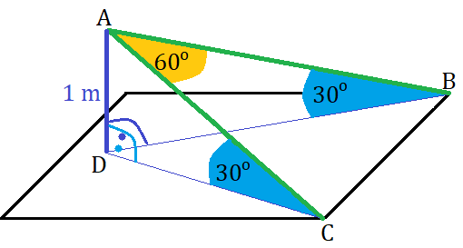 Zosia postanowiła rozbić namiot. Każdy jego maszt ma długość 1 metra i należy go przymocować dwoma linkami. Kąt pomiędzy dwoma linkami powinien wynosić 60º, a pomiędzy linką a podłożem 30º. Oblicz, jakiej długości powinny być linki i w jakiej odległości od siebie należy wbić ich końce.