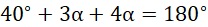 Wykorzystujemy sumę kątów wewnętrznych trójkąta oraz zależność z zadania.