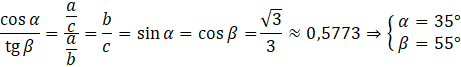 Oblicz miary kątów 𝛼 i 𝛽 w zaokrągleniu do jedności, wiedząc, że w trójkącie prostokątnym stosunek cosinusa kąta ostrego 𝛼 do tangensa kąta ostrego 𝛽 jest równy