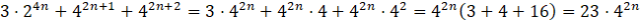 Masz wykazać, że dla każdej liczby naturalnej wyrażenie 3 ⋅ 24n + 42n+1 + 42n+2 można podzielić przez 23.