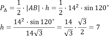 Zauważ, że w trójkącie równoramiennym środkowa na podstawę jest wysokością trójkąta. Użyj twierdzenia cosinusów a następnie wzorów na pole trójkąta.