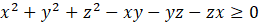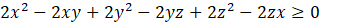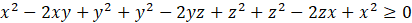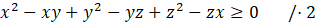 Masz wykazać, że prawdziwa jest nierówność 𝑥2 + 𝑦2 + 𝑧2 − 𝑥𝑦 − 𝑦𝑧 − 𝑧𝑥⩾ 0. Wiadomo, że 𝑥, 𝑦, 𝑧 należą do liczb rzeczywistych.