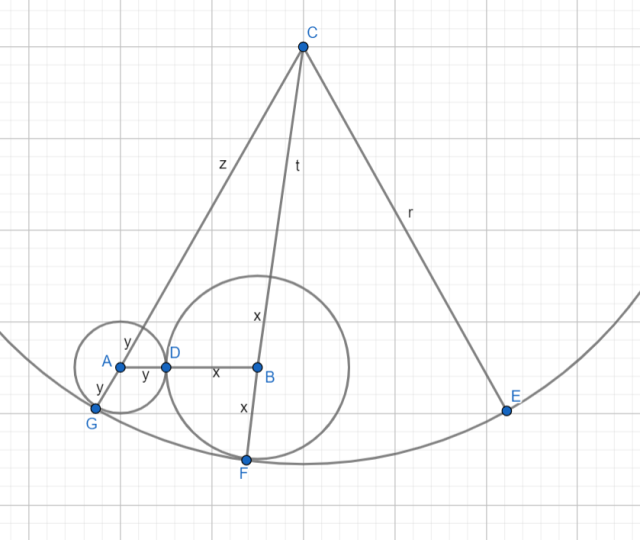 Oznacz długości odcinków tak, jak na rysunku powyżej. Zapisz promień okręgu na 2 sposoby, wykorzystując długości z i t. Podstaw wyliczone zmienne do równania obwodu trójkąta i sprawdź, że jest on faktycznie równy 2r.