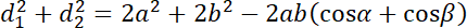 Zgodnie z drugim twierdzeniem cosinusów dla każdego trójkąta, kwadrat długości jednego boku trójkąta jest równy sumie kwadratów długości pozostałych dwóch boków pomniejszonej o dwa razy iloczyn tych długości i cosinusa kąta między nimi. Wykorzystujemy tę własność dla trójkątów utworzonych przez przekątne i boki równoległoboku.