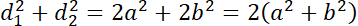W rezultacie uproszczeń otrzymujemy wynik, że suma kwadratów długości przekątnych równoległoboku jest równa sumie kwadratów długości wszystkich jego boków.